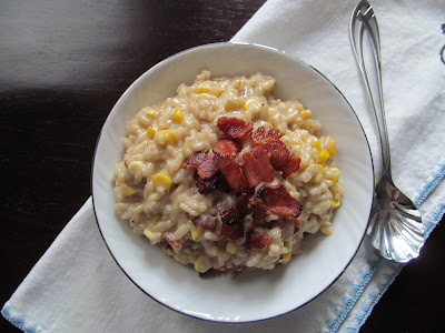 Once you get down to about 2 ladles of stock remaining, that is when you'll add the rest of the ingredients. Add in the remaining stock, the cream cheese, corn and Parmesan cheese. Stir everything together until it is melted and delicious. When you taste the rice it should be "al dente", meaning it's tender but still has some bite left to it. Sprinkle in half of the reserved bacon and then plate the risotto in a shallow bowl or on a plate along side a fresh salad. Top with more bacon pieces and more Parmesan cheese. Serve and eat immediately.